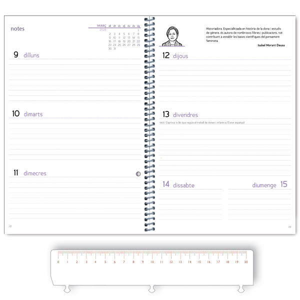 El cos de l’agenda i els seus apartats són pràctics i útils com sempre, però, a més, l’agenda inclou 48 dones rellevants.